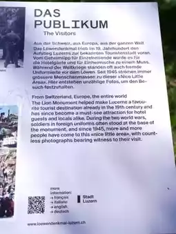 除了欣赏纪念碑的雄伟壮丽,参观狮子纪念碑还能让您一窥世界历史上的另一重要篇章。这不仅是一处旅游景点,更是游览卢塞恩时不可错过的忠诚、勇气和牺牲的象征。