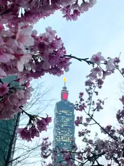 📍松枝公园最大的卖点就是可以把台北101一起拍进镜头🏙,再加上蓝天白云,画面层次感超强!如果想要拍出最浪漫的氛围,推荐在17:50日落时分来,这时101开始亮灯✨,樱花和城市灯光交相辉映,拍出来的照片特别有艺术感😍。