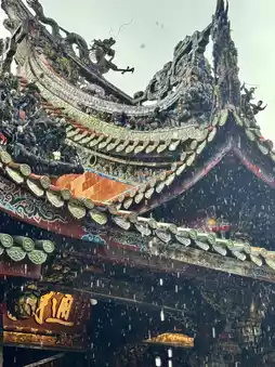 雨滴静静地落在寺庙的屋顶上,雨水打湿了寺庙,映衬着精雕细琢的龙形图案,更显灵动。人们踏上湿漉漉的木地板,点燃香烛,默默祈祷。🌧️雨天