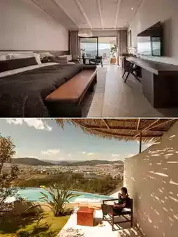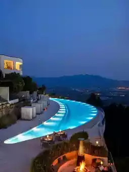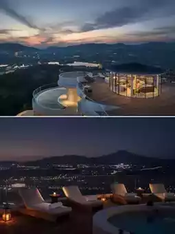 豪华湖畔度假胜地,四周环绕着休眠火山和雾气缭绕的森林,白色建筑和蓝色新月形无边泳池🏊♀,散发着浓郁的地中海风情