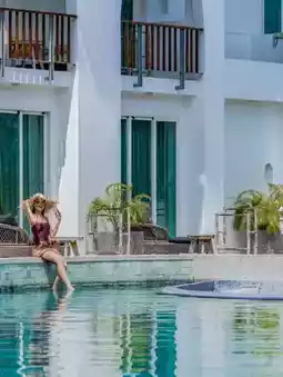 🍃 进入房间,您会发现一个环绕建筑的弧形泳池,碧绿的池水与洁白的墙壁交相辉映,从各个角度都散发着轻松惬意的气息。