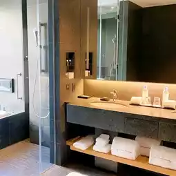 房间位于历史建筑内,装修风格非常日式现代,细节之处也处理得非常到位。浴室的地暖和桑拿房超级舒服!洗漱用品补充很及时,每2-3套就会补充一次,护肤品是Three的,咖啡胶囊也很多,还有两个品牌的十几种茶包,既好看又好喝。每天还会赠送两支高品质的钢笔🖊,可以带走。🍴