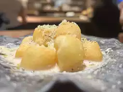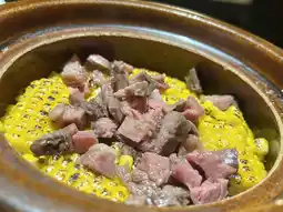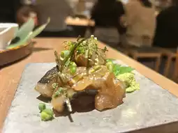 芝麻鲭鱼也香气扑鼻,与酒类饮品相得益彰。特色砂锅饭则以“日本玉米×鲣鱼干黄油×和牛”的奢华组合为特色。从下单到出餐大约需要40分钟,所以最好提前预订。新鲜煮熟的米饭散发着干鲣鱼的香气,搭配浓郁的黄油,绝对是必尝之选!
