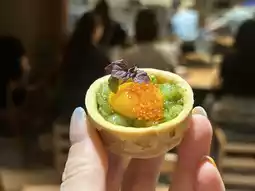 各式开胃菜琳琅满目,每一道都精心烹制,令人回味无穷。炸土豆丸子配清酒糟奶油,看似不搭调,却意外地美味,让人欲罢不能。金枪鱼牛油果海苔天妇罗佐以泡沫酱油和牛油果酱,牛油果的绵密、酱油的鲜美以及芥末的辛辣完美融合,令人回味无穷!