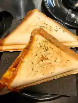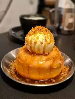 主菜我选了辣味披萨三明治,吃的时候有点狼狈,但味道还是不错的。甜点我点了肉桂香草芭菲,一个香草冰淇淋球放在甜甜圈上,撒上肉桂粉、红糖和糖浆。