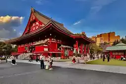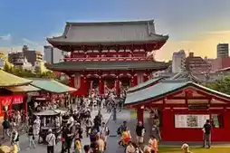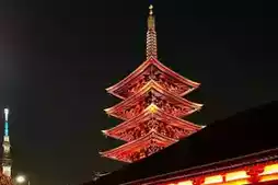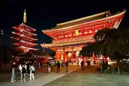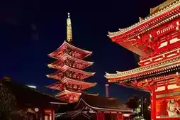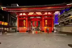 浅草寺位于日本东京台东区。它始建于推古天皇在位第三十六年(公元628年),相传渔民在隅田川中打捞到一尊金质观音像后,便开始修建寺庙。它是东京现存最古老的佛教寺庙。寺庙的主要建筑为江户风格,包括雷门、五重塔(日本第二高的佛教宝塔)和正殿。雷门始建于公元942年,1960年因火灾重建,其巨大的灯笼和门内140米长的石板路共同构成了东京的标志性景观。