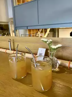 我点了一杯苹果汁,盛放在设计精美的玻璃杯中,与简约而温馨的室内装潢相得益彰。苹果汁清爽怡人,恰到好处地为都市中的片刻宁静锦上添花。