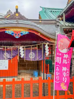朱红色与翠绿色交相辉映的主殿是神田神社最具代表性的特色。其他建筑也色彩明快,这里还供奉着一匹“神马”。