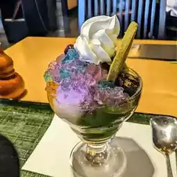 我点了季节限定的绣球花套餐,其实就是抹茶水晶冻冰淇淋。原本的绿色抹茶口味换成了色彩鲜艳的绣球花口味,颜色非常亮丽。