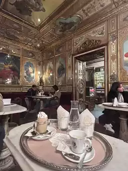 位于圣马可广场的弗洛里亚咖啡馆是世界上最古老的咖啡馆,内部装潢如同博物馆一般,比我想象的还要奢华美丽。不过,菜单上的所有菜品都非常昂贵。水是免费的,所以不用单独点!我们选择了店内的座位,但如果你坐在外面,还可以欣赏现场钢琴和小提琴演奏!