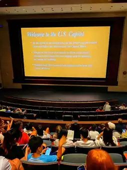 我参加了英语导览,我们拿到了连接导游麦克风的耳机,即使在人多的地方也能清楚地听到她的讲解。导览首先播放了一段30分钟的美国历史介绍影片,随后是大约半小时的国会大厦内部参观,导游带领我们参观了一些对游客开放的房间。