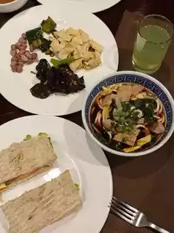 早餐在一楼的自助餐厅供应。菜品种类有限,但摒弃预制食品的做法颇具创新性。这里有烤肉、乐面(烤面和红烧面)、传统豆腐花、自制帕尼尼、鲜榨果汁和皮蛋粥等当地特色菜。食物的品质可能是我在山东住过的几家酒店中最好的。总的来说