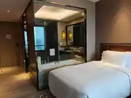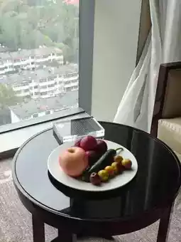 升级到更高楼层的豪华客房,唯一不足之处就是比更高楼层的行政客房少了一台咖啡机。所以,除非您酒量不错,否则多花那一百块钱并不值得。房间的装修风格是世纪交易所一贯的老式风格,庄重而内敛,但略带牛马的气味。房间和浴室之间用透明玻璃隔断隔开。迎宾水果包括黄瓜。
