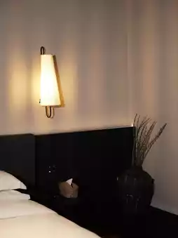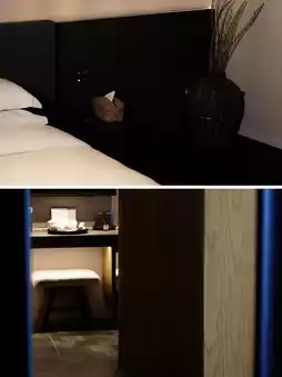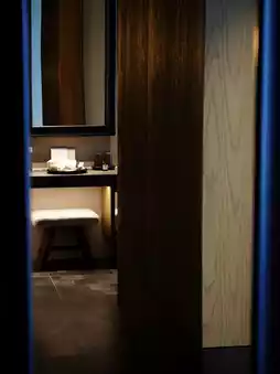 整个房间融合了侘寂风格和现代中式美学,古朴的木质纹理与冷色调的大理石相得益彰,从地板到天花板都散发着奢华的气息!房间里配备了Marshall音响、Dyson吹风机,甚至还有小众的高端洗浴用品!酒店的