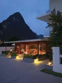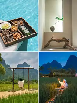 酒店提供中式自助早餐,包括桂林米粉等当地特色美食。千万不要错过桂花茶——香气馥郁,略带甜味,是夏日放松的完美之选。露天餐厅俯瞰稻田和远山,用餐🍽亦是一场赏心悦目的美景~