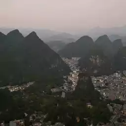 到达山顶后,眼前的景色令人震撼——360°全景尽收眼底:阳朔的灯火璀璨,漓江在群山间蜿蜒流淌,无垠的石灰岩山峰绵延至薄雾之中。我选择在那里欣赏日落——万物都被染成橙色,鸟儿在空中盘旋。简直美得像仙境一般。🌄