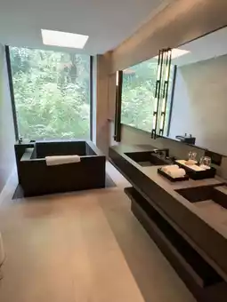 我们的房间简直是梦想成真。房间宽敞、设计优雅,并巧妙地融入了天然材料,完美地融合了奢华与和谐。而最令人惊艳的莫过于浴缸正对着一扇全景窗,窗外便是阳朔雄伟壮丽的群山。在那里沐浴仿佛置身于一片静谧之中,只有寂静无声,阳光透过山峰洒下斑驳的光影,以及无垠的青山云雾缭绕。每天清晨醒来,眼前的景色宛如仙境。