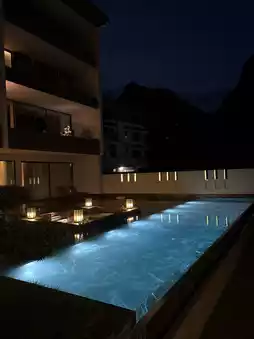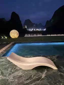 夜幕降临,整个氛围焕然一新。泳池区域白天和夜晚都可尽情享受,夜晚灯光柔和,营造出浪漫而如梦似幻的氛围。夜空下,群山倒映在水面上,宛如梦境一般。