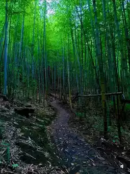 继续向上走,竹径变得陡峭起来,但在拐角处,我却意外地发现了一处景致:一条木板栈道悬于竹林之中,旁边悬挂着手工竹灯笼,红色的绳子在风中轻轻摇曳。站在栈道上,眺望远方,万亩竹林层层叠叠,一直延伸到天际。近处的竹子挺拔耸立,远处的竹浪翻滚,就连天边的云朵也泛着淡淡的绿色。此刻,无需刻意寻找角度;每一帧画面都美得令人窒息:“万亩翠绿竹林直达天际,步道如画般悬于空中。”