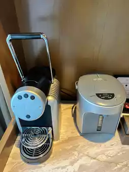 房间里还配备了复古咖啡机、圆形咖啡胶囊和热水器。180