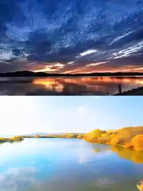 🍂 Duolun Lake is a beautiful prairie lake surrounded by grasslands, hills, sandy areas, and shrubs. In autumn, the blue sky and lake blend with trees in yellow, orange, green, and other colors, creating a splendid autumn painting.