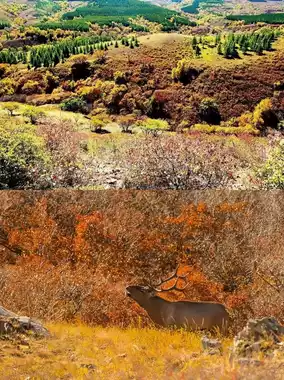 🍁 Forests and sandy lands stretch across the park, with colorful foliage rolling through. The layered woods are vibrant, wild animals occasionally appear to pick fruits, and people gather to worship the aobao and collect herbs, all filled with the atmosphere of autumn harvest.