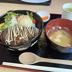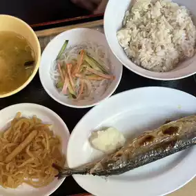 I ordered a loco moco bowl at the prison's cafeteria, and my friend ordered a sanma (Pacific saury) set meal. For some reason, food tastes even better when you're traveling! 😋