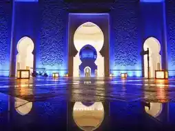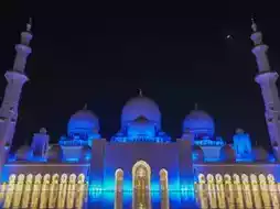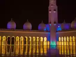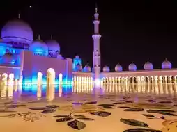 The blue and purple lights illuminate the entire white mosque structure, reflecting off the marble floors, creating a fairytale-like atmosphere. The nighttime ambiance, with its unique lighting and air, adds an extra layer of solemnity and tranquility.