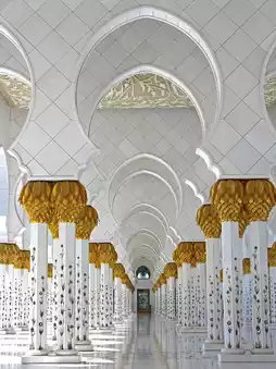 As sunlight slowly descends, cutting through the sky, the white domes of Sheikh Zayed Mosque catch the first light, radiating a dazzling brilliance. The marble floors gently reflect this light, creating a mirror-like connection between the heavens and the earth.