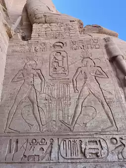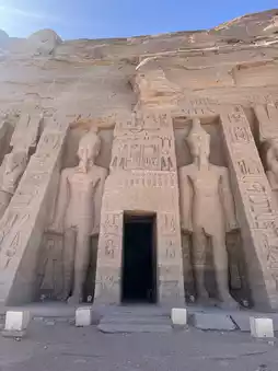 Carved into the rock, it consists of the Great Temple, with its colossal seated statues of Ramses II flanking the facade, and the Small Temple for Queen Nefertari.