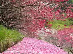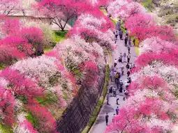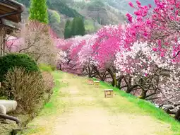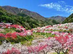 Near Hirugami Onsen, a 4-kilometer trail is lined with over 5,000 peach trees in shades of red and white. Adjacent to the trail is National Route 256, which connects the Ina Valley and the Kiso Road. Along this 40-kilometer stretch, tens of thousands of peach trees bloom, earning it the nickname 'Peach Blossom Road'.