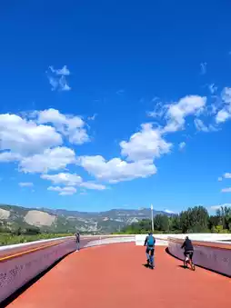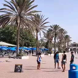 Along the promenade with a stretch of palm trees , people are jogging, walking, cycling, playing balls and many more.