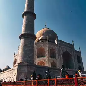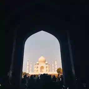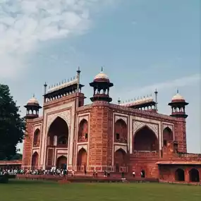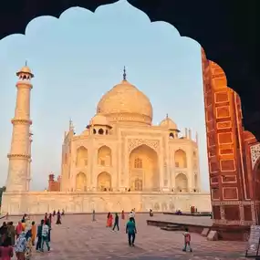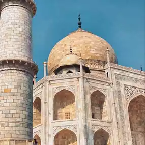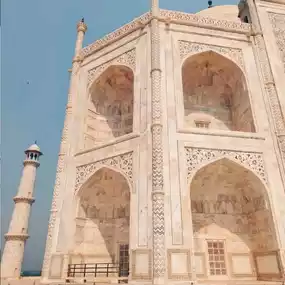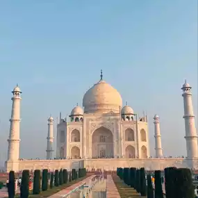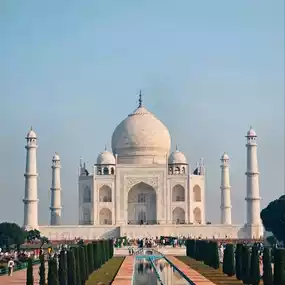 The Taj Mahal (/ˌtɑːdʒ məˈhɑːl, ˌtɑːʒ -/ TAHJ mə-HAHL, TAHZH -, Hindi: [taːdʒ ˈmɛɦ(ɛ)l]; lit. 'Crown of the Palace') is an ivory-white marble mausoleum on the right bank of the river Yamuna in Agra, Uttar Pradesh, India.