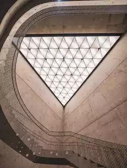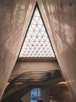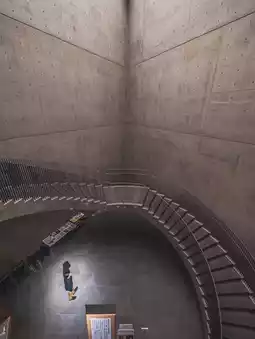 features a spiral staircase and a triangular ceiling that lets in natural light, and the combination with the concrete architecture