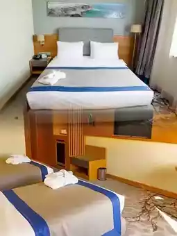 The hotel's leisure facilities are also plentiful🎈. There's a huge outdoor swimming pool with crystal-clear water, where you can swim while enjoying the beautiful sea view. Comfortable lounge chairs are placed by the pool, perfect for sunbathing and relaxing after a swim. The hotel also offers a variety of water activities, such as sailing and kayaking, allowing water sports enthusiasts to challenge themselves and experience the charm of the sea. Additionally, there's a beach volleyball court where you can have fun with friends on the sandy beach.