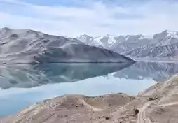 One of the eye-catching spots on the way to Taxkorgan, and a popular internet-famous location, Baisha Lake is located in Akto County, Kizilsu Kyrgyz Autonomous Prefecture. It is a plateau lake connected to a reservoir, situated at an altitude of 3,300 meters. Surrounding it are the Baisha Mountains, a high mountain in the Pamir Plateau range. Due to long-term weathering, the rocks at the mountain top have turned into powdery sand that cascades down, covering the mountain body, hence the name Baisha Mountain. It consists of more than ten hills of various sizes, with the green mountain body covered by white sand. The snow-capped mountains and the lake complement each other, showcasing a stunning Tiffany blue that is breathtaking. However, the plateau scenery is highly dependent on weather and lighting. When I visited three years ago, it was windy with drifting snow, the sky was grayish yellow, and the lake water was yellow-green—truly a "photo deception" as the legend says. This time, the weather finally gave me a clear blue sky with no wind, and the lake surface was calm like a mirror. Arriving in the afternoon at the north slope, which was backlit, the reflection of the continuous Baisha Mountains looked like a computer-generated image. The distant lake surface showed a deeper blue than the sky, while the nearby water was apple green. We lingered for two hours among the uneven sandy ground, with surrounding peaks covered in the white snow of the Pamir Plateau. Clouds began to drift slowly across the blue sky. Away from the crowds, the tranquility was elegant, as if isolated from the world. I kept changing lenses and using my phone, constantly composing the scenes before me, but the final photos still could not fully capture the true colors and awe I saw with my own eyes.