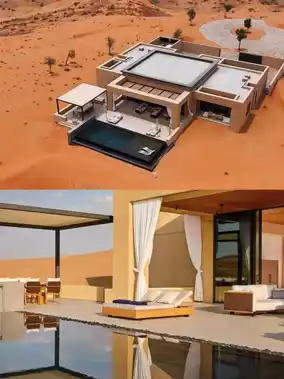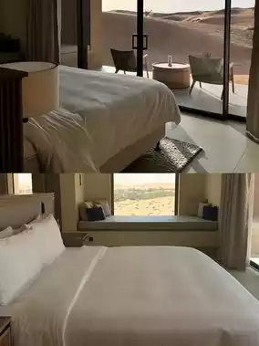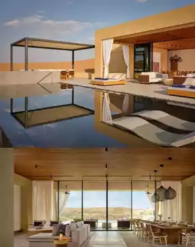 The resort features 108 private villas with terraces and pools, across 4 room types, each exceptionally spacious. Inspired by traditional Bedouin architecture, every villa opens to your own expansive desert vista. The most unique feature is the tented accommodations, immersing you in the majestic desert scenery for an ultimate glamping experience—occasionally even spotting desert gazelles.