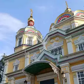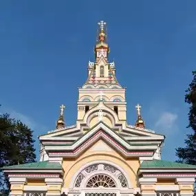 Today we have the opportunity to visit Almaty, the largest city in Kazakhstan. It used to be the capital city from 1929-1998 before moving to Astana. In Almaty, there is a very beautiful old cathedral, Ascension Cathedral, or what the locals call Zenkov's Cathedral, located in Panfilov Park. It is an Orthodox cathedral in bright yellow, decorated with beautiful domes. It is more than 100 years old. It was built by the first bishop of the Turkistan eparchy and designed by architect Pavlovich Zenkov. Construction began in 1904 and was completed in 1907.