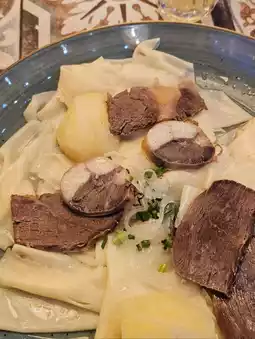 For the main course, I ordered Beshbarmak, a traditional Kazakh dish featuring horse meat and horse meat sausage served with thin flour noodles. The horse meat was tender and savory, while the horse meat sausage had a burst of rich flavor. The accompanying potatoes were soft and had a great texture. The total cost for the apple juice and Beshbarmak was 8,250 Tenge (approximately 21,700 KRW).