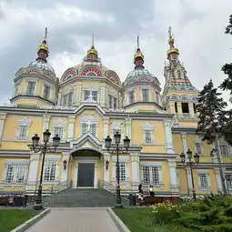 When the sun sets over Panfilov Park, the Ascension Cathedral transforms into a magical nighttime landmark. ✨ Its golden domes and colorful facade are softly illuminated, reflecting on the quiet pathways and creating a serene, almost fairytale-like atmosphere 🌌💛.