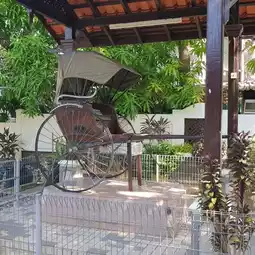 It is a traditional Malay architecture house built on stilts, nipah palm leaf roofing, wooden plank flooring and a verandah and is said to be from the 1900.