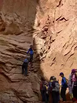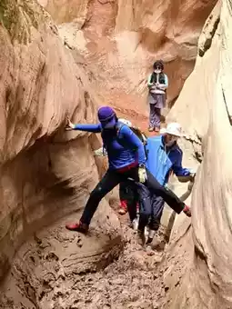 It had rained here two days before our visit, making the canyon muddy and difficult to traverse. Hiking through the canyon required lateral movements and weaving up and down, with the deepest mud trapping feet. Before reaching the narrowest part of the canyon, there was a small cliff of three to four meters that required rope-assisted climbing.
