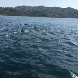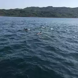 A dolphin floats to the surface of the water to breathe. You can hear a sound like air leaking out of the water and the sound of the tail slapping the water. If you see a dolphin jumping, it means you are very lucky!