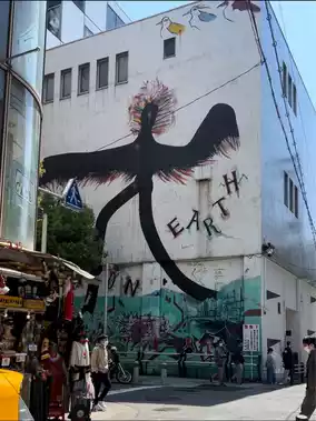 As I wandered around downtown Osaka I stumbled across the coolest area ever. Amerika-mura, also known as America Village, is an entire area that feels like you’re almost not in Japan. Firstly, there are an endless amount of thrift stores ~ everyone who works there and everyone who comes to hang out here has the most incredible vibe. It just feels so cool to be here with them. The buildings themselves have so much interesting artwork and there is also lots of graffiti and street art!