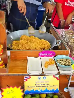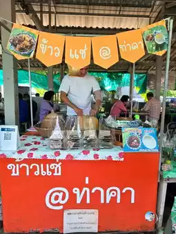 Beyond agricultural products, the delicious food here is just as delicious! For example, the Khao Chae @ Tha Kha, prominently displayed on the sign, is a must-try. Or try crispy fried items like Khun Kai Mee Krob (Thai Crispy Noodles in Lime & Citrus Flavor), stir-fried in a large pan, golden brown. Just the sight of it makes your stomach growl! And don't miss the traditional Vietnamese dessert, Khanom Bueang (Vietnamese Pancakes), prepared fresh from a boat by the vendors on the water. It's an amazing dining experience.