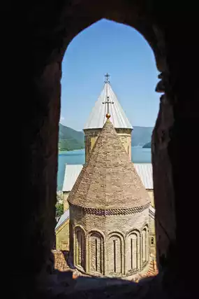 1. Ananuri Lake View: Low-angle shot of "castle reflection and boats"