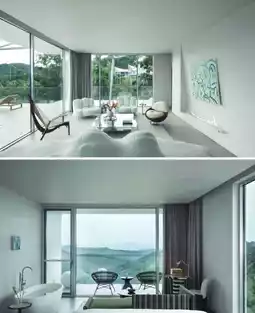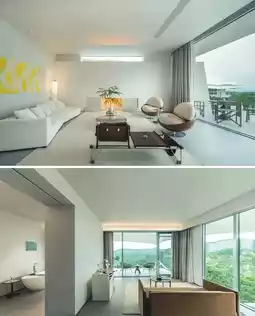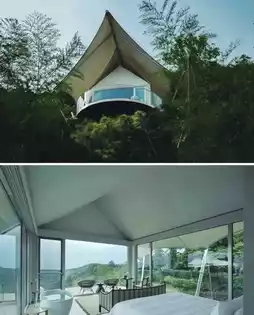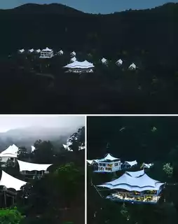 11 pure white tent buildings are hidden halfway up the mountain, suspended in the air at an altitude of 220 meters. The tents are luxurious inside and out, and each room is a balcony view room. Open the curtains to see the beautiful mountains. The natural landscape and quality rest space are fully integrated, and the independent bathroom with dry and wet separation makes the stay more comfortable. When staying with a baby, the tent buildings are dotted on the tea sea forest-covered hillside, enjoying a panoramic view of the beautiful mountains. The beautiful architectural shape breaks the pure straight-line architectural style, and the combination of terrace and roof is like the deck of a sailing ship, giving people a feeling of walking in the clouds.