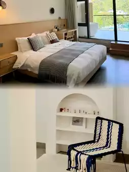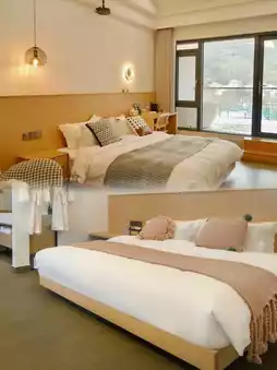 The guesthouse has an outdoor swimming pool, billiard table, tea room, chess and card room, children's playground, and other entertainment facilities. There is also a hot spring pool, which is very suitable for cooling off in summer or keeping warm in winter. All 14 rooms have floor-to-ceiling windows and mountain views. Some rooms also have an outdoor sun terrace or private hot spring pool. The interior is designed in a fashionable INS style, and the furniture is exquisite.