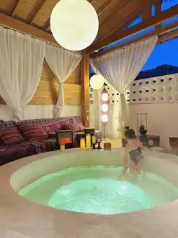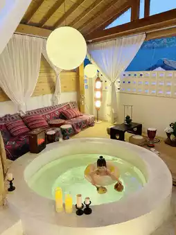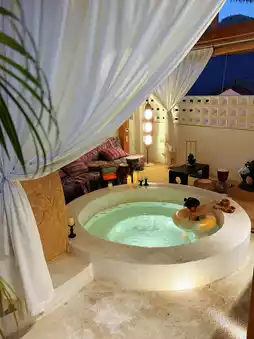 Soaking in the private hot spring in winter is so comfortable.