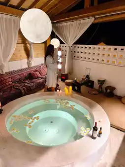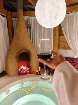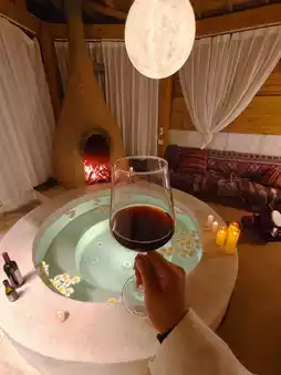 After the hot spring, how could I miss a glass of red wine? Under the moonlight, I took a sip of red wine and felt the liquid dance on my tongue. At this moment, all my worries disappeared, leaving only my love and enjoyment of life.